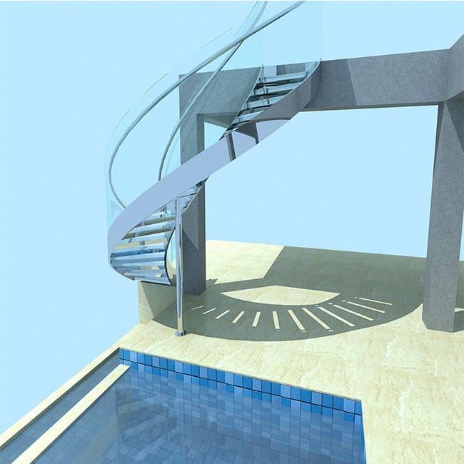 Curved staircase consists of staircase curved beam, treads, stair fence, handrails.