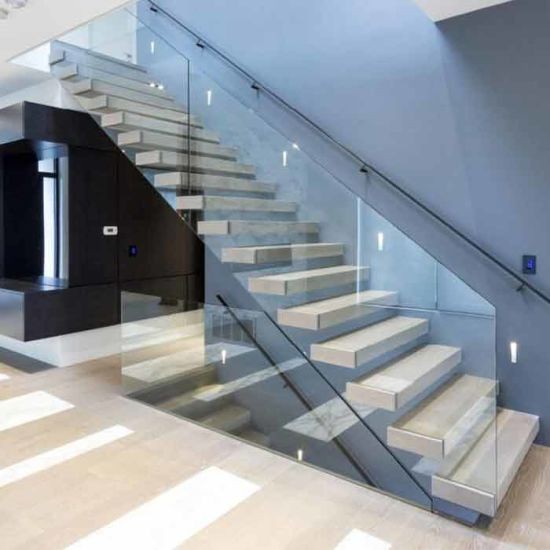 Floating staircase consists of invisible stringer beam, treads, stair fence, handrails.