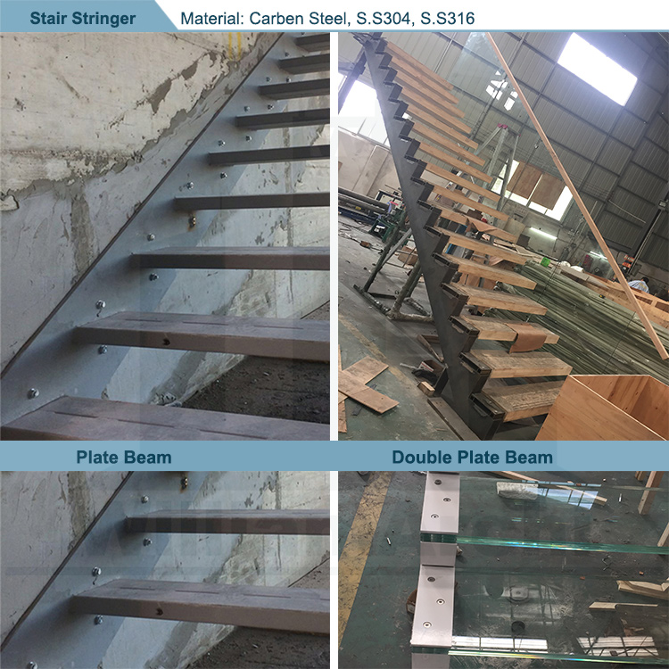 Normally use metal plate as stringer. The floating staircase stringer normally hidden into wall or fascia mounted on wall.