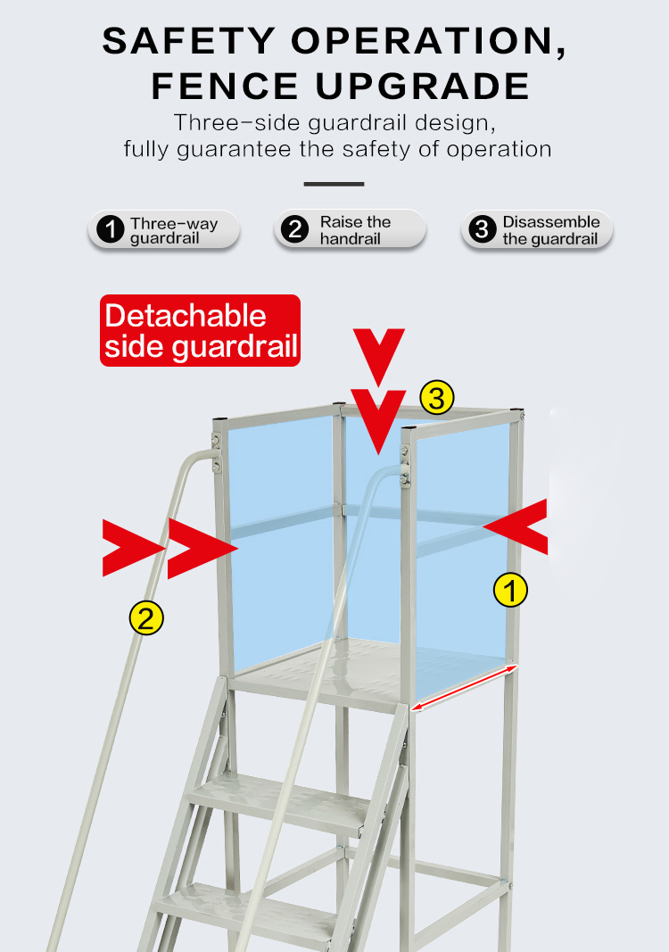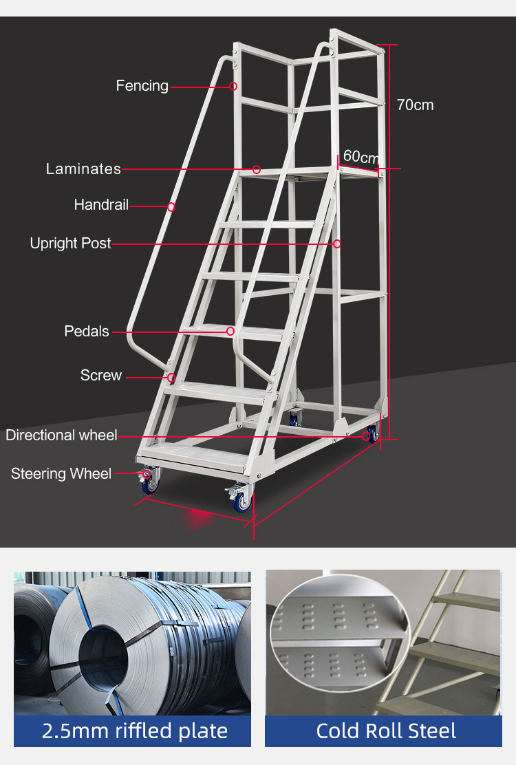 It is equipped with two steering casters and two fixed casters, which can be moved flexibly. It is a warehouse and storage equipment,It is suitable for heavy load and daily operation; it can be disassembled,It is simple and convenient for transportation. Customers from other places deliver goods in the form of unassembled products, and can assemble them by themselves,The product meets the standard of EN131. Equipped with pedal locking mechanism, the bottom pedal can be pressed automatically Moving the fixed ladder and pressing the unlocking pressure bar of the bottom pedal can easily move the pick-up ladder.