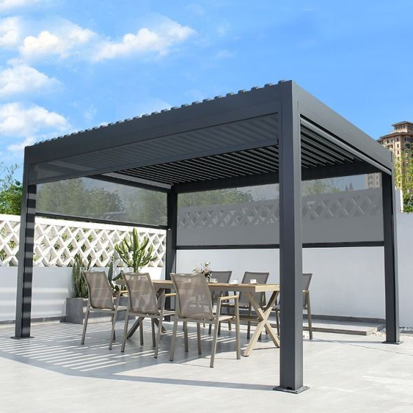 WilliamArchi's Outdoor aluminium profile gazebo with shutters is a combination between pergola and horizontal louver which is completely made of aluminum and allows light and breeze when open. Using an electric telescopic engine connection system through parts and aluminum extrusions specially designed, the slats are dosed completely sealed preventing the passage of light and water. When closed the slats become channels that carry the water to the sides that have their own system of canals and water should turn towards the poles where it drains. Guaranteed to withstand severe climatic changes and winds of up to 100 KM/h . (The resistance is not guaranteed under the weight of snow).