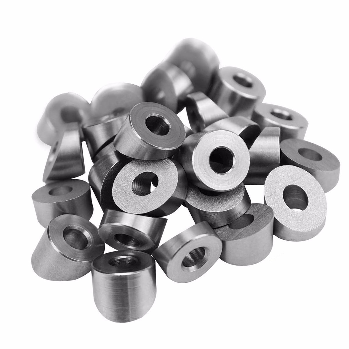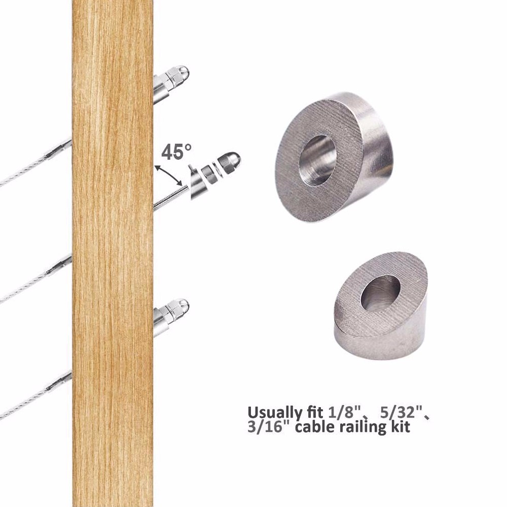 Feature: This angled washer is perfect for planning your own cable railing project, providing beveled washer for the angle of your garden, stairs and aisle beside for indoor or outdoor applications. (wood, steel, aluminum post on deck railing) These Angled stand off washers are used for termination on end posts that have angled or off set holes on stair railings. These washers can be used with threaded end terminals; short and long stud terminals; and even tuner terminals.