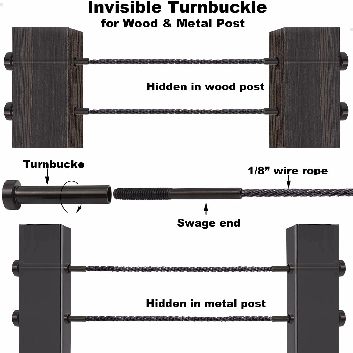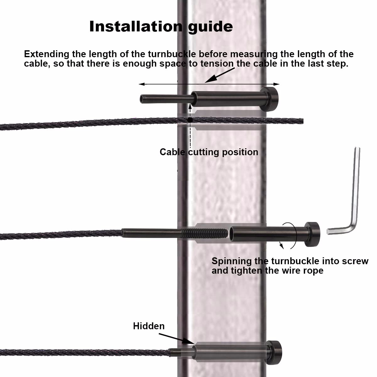 【Completely Invisible & Beautiful Look-Black】You can hide all the terminals of the black tensioner kit in the posts with 3"-6" width . The heads on both sides can be hidden in the posts by drilling a 5/8 inch hole. Finally, you can only see the cable. Its appearance is neat, beautiful.