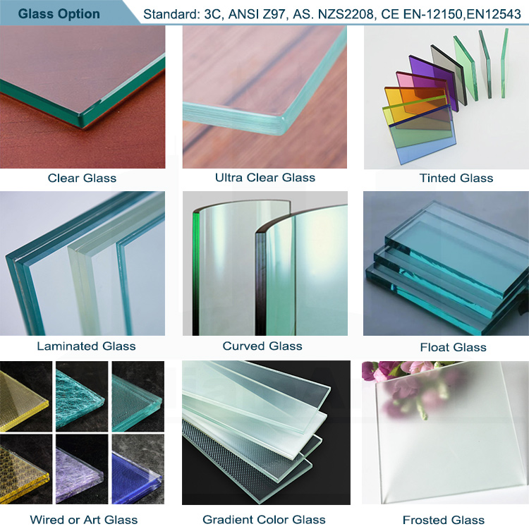 Glass type: single tempered glass 3/8″, 1/2″, 5/8″, 3/4″, laminated glass 13.52mm, 17.52mm, 21.52mm