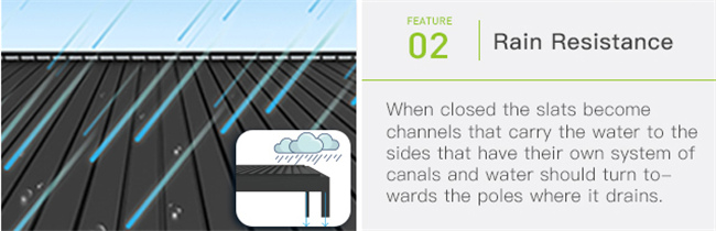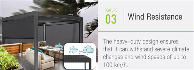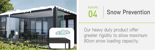 WilliamArchi's waterproof aluminum pergola is a combination between pergola and horizontal louver which is completely made of aluminum and allows light and breeze when open. Using an electric telescopic engine connection system through parts and aluminum extrusions specially designed, the slats are dosed completely sealed preventing the passage of light and water. When closed the slats become channels that carry the water to the sides that have their own system of canals and water should turn towards the poles where it drains. Guaranteed to withstand severe climatic changes and winds of up to 100 KM/h . (The resistance is not guaranteed under the weight of snow).